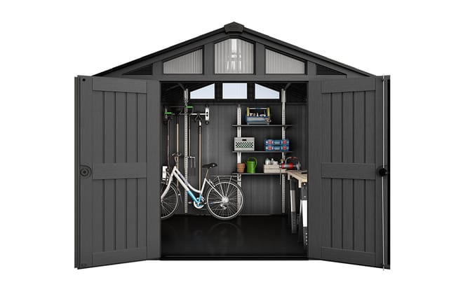 The 10x8 Stronghold shed is the perfect classic and durable addition to your home storage. It boasts a beautiful full-length skylight, three large windows in the front and back, as well as extra-wide double doors. This double door shed allows you to easily move large items in and out of it. This double door shed also has an included sloped floor that allows you to store large items such as riding lawn mowers, ladders, bikes and gardening tools. It’s a durable resin shed that’s steel reinforced, has thick double walls and is even weather resistant. It’s wind resistant up to 90 mph, and the roof can withstand up to 30 PSF of snow without issue! The shed is low to no maintenance, and it won’t crack, rot or peel. The backyard shed also comes in a kit that boasts easy assembly, with only basic tools needed. Add this classic peaked roof shed to your outdoor space.