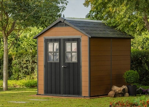 Las casetas Newton combinan una resistencia increíble con un estilo atemporal en color marrón. Sus paneles de múltiples capas están hechas con polipropileno 100% reciclable y cuenta, como prestación destacada, con un refuerzo de acero que la convierte en la elección perfecta allí donde se producen acumulaciones de nieve.